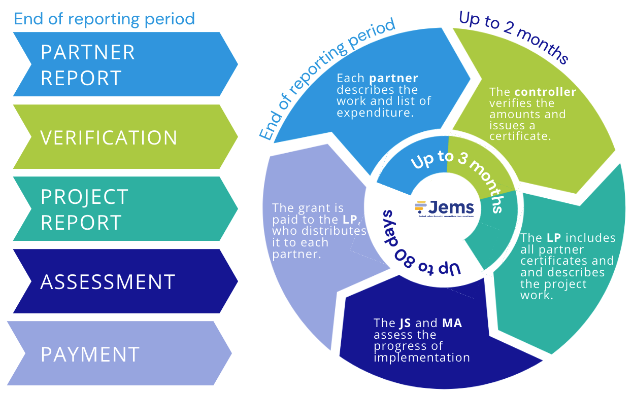 This chapter explains the procedure for partners compiling 6-monthly partner reports, the control of these reports and the procedure for lead partners compiling the project report. All progress reporting is to be done in the electronic monitoring system Jems, and specific guidelines for reporting in Jems are made available by the programme. For information about small-scale project progress reporting, please see the next section.