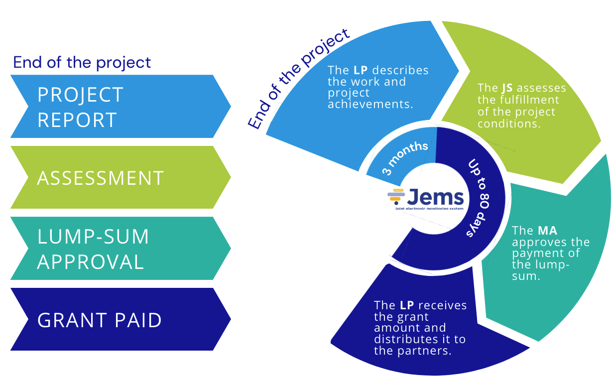 For lump sum projects, there is no request for underlying financial or procurement documents with a view to checking the amounts incurred and paid by the beneficiary, and no certification by controllers. In Jems, the lump sum reports will be fast-tracked, meaning that no project action is needed for the financial reporting.