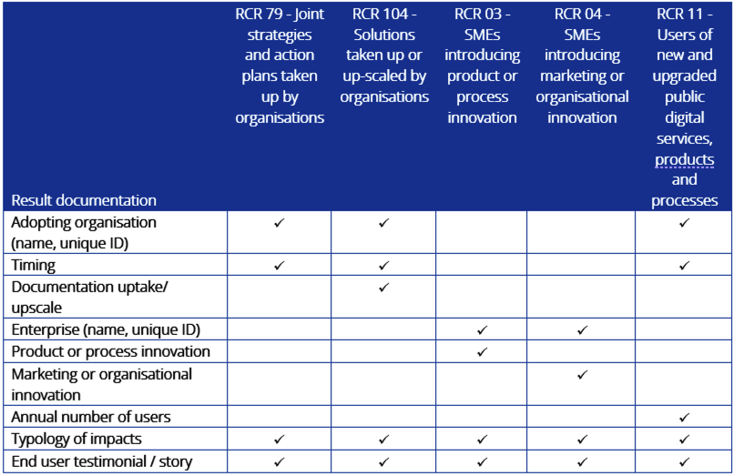 For each counted output or result, documentation needs to be provided in line with the minimum documentation requirements for the relevant indicator listed in this document.